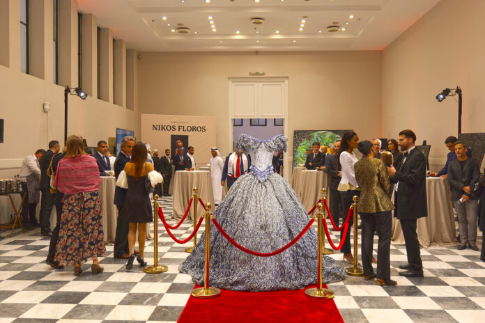 Το αστραφτερό μεταλλικό αλουμινένιο φόρεμα της Μαρίας Κάλλας που φιλοτέχνησε ο γλύπτης Νίκος Φλώρος εμπνευσμένο από εκείνου με το οποίο η Diva ερμήνευσε την “ Τραβιάτα” του Βέρντι και που ήρθε ιδικά για την εκδήλωση αυτή απευθείας από την όπερα του Ντουμπάι όπου και εκτίθεται από τον Μάϊο 2023 στην κεντρική αίθουσα της όπερας του Ντουμπάι στα πλαίσια του εορτασμού των εκατό χρόνων από την γέννηση της Μαρίας Κάλλας! το γλυπτό συγκλόνισε και εντυπωσίασε άπαντες, ευρισκόμενο στο κέντρο της αίθουσας με τα εκθέματα.