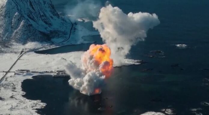 Το βίντεο που κάνει τον γύρο του διαδικτύου δείχνει τη στιγμή της αποτυχημένης τελικά εκτόξευσης και τον πύραυλο να πέφτει στα παγωμένα νερά και να εκρήγνυται.