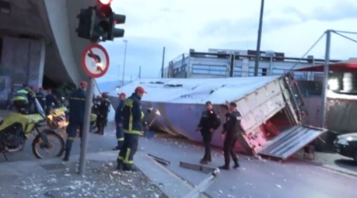 Σοβαρό τροχαίο με πτώση νταλίκας συνέβη το απόγευμα της Πέμπτης στη γέφυρα της Πέτρου Ράλλη στη Θηβών.