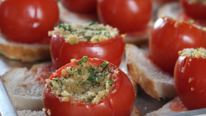 Ανακατεύουμε και γεμίζουμε με το μείγμα τις ντομάτες. Τις βάζουμε σε πιατέλα, τοποθετούμε το καπάκι τους και τις σερβίρουμε κρύες.