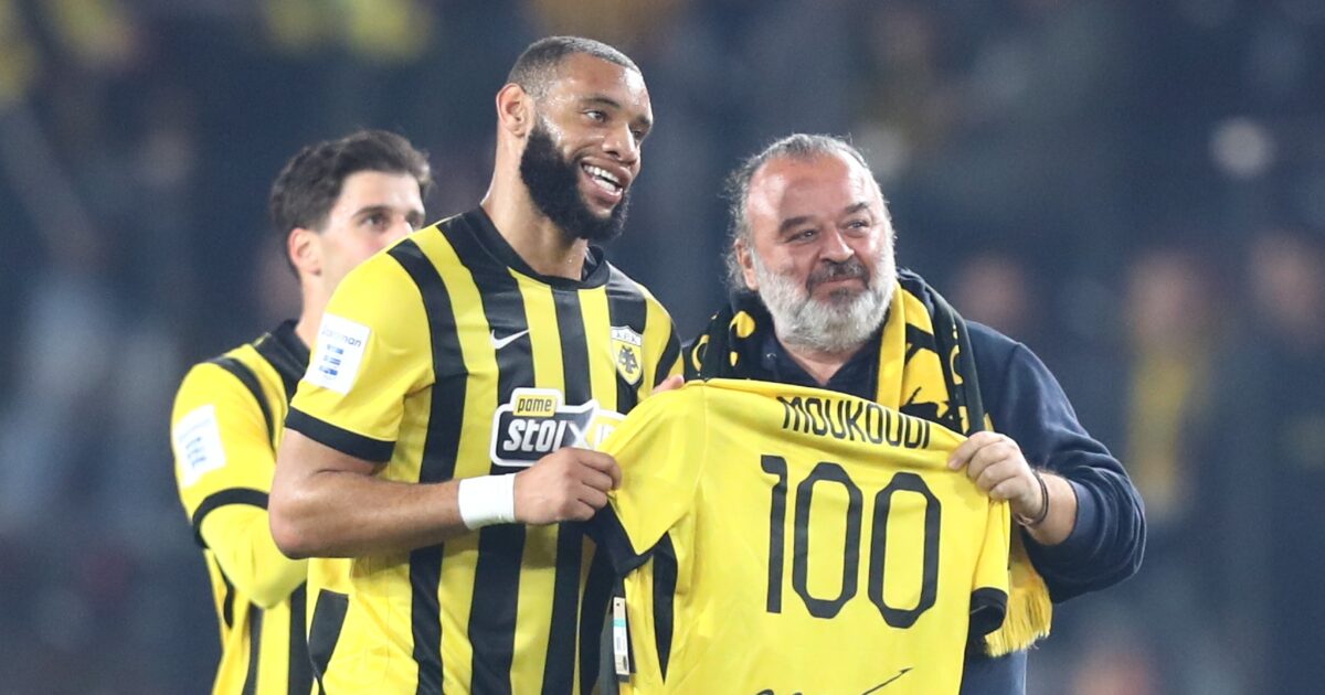Ο Αρόλντ Μουκουντί συμπλήρωσε κόντρα στον Ατρόμητο, 100 συμμετοχές με τη φανέλα της ΑΕΚ και ο ιδιοκτήτης της “κιτρινόμαυρης” ΠΑΕ, Μάριος Ηλιόπουλος κατέβηκε στον αγωνιστικό χώρο για να τον συγχαρεί.