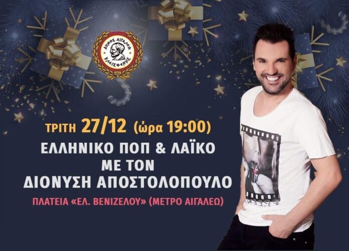 Την Τρίτη 27/12 (19:00) στην πλατεία «Ελευθερίου Βενιζέλου» συναυλία με ποιοτικό ελληνικό ποπ και λαϊκό με τον Διονύση Αποστολόπουλο (Διόνυσος).
