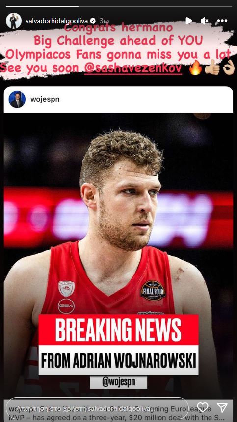 Το απόγευμα του Σαββάτου 1/7 ο Σάσα Βεζένκοφ, αποφάσισε να γνωστοποιήσει την απόφασή του να αποχωρήσει από τον Ολυμπιακό για χάρη των Σακραμέντο Κινγκς. Με ανάρτηση στον προσωπικό του λογαριασμό έκανε γνωστή την απόφασή του, δημιουργώντας ένα τεράστιο κενό στον “ερυθρόλευκο” οργανισμό, με πολλά από τα μέλη της ομάδας, να σπεύδουν να τον αποχαιρετήσουν και να του ευχηθούν για το νέο κεφάλαιο στην καριέρα του.