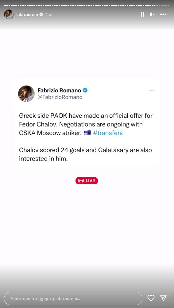 «Ο ελληνικός σύλλογος ΠΑΟΚ έκανε επίσημη πρόταση για τον Φεντόρ Τσαλόφ. Οι διαπραγματεύσεις συνεχίζονται με τον επιθετικό της ΤΣΣΚΑ Μόσχας. Ο Τσαλόφ πέτυχε 24 γκολ και η Γαλατασαράι επίσης ενδιαφέρεται» έγραψε ο Ιταλός.//Α.