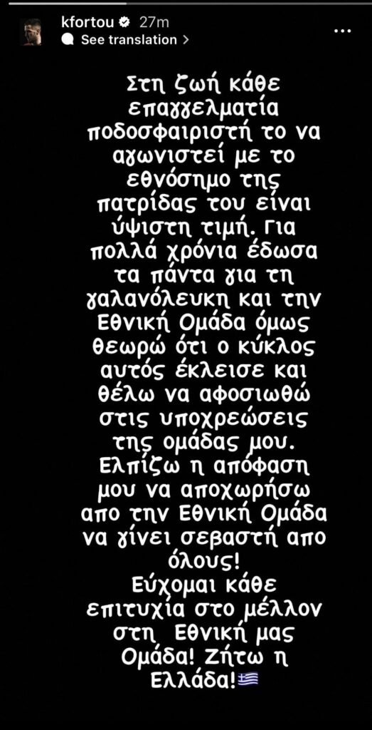Ο Κώστας Φορτούνης αποφάσισε να ρίξει τίτλους τέλους στην παρουσία του στην Εθνική Ελλάδας και μέσω του λογαριασμού του στο Instagram έκανε γνωστούς τους λόγους που τον οδήγησαν στη συγκεκριμένη κίνηση, τονίζοντας ότι θέλει να αφοσιωθεί στην ομάδα του, προσθέτοντας ότι θέλει να γίνει σεβαστή η άποψή του.