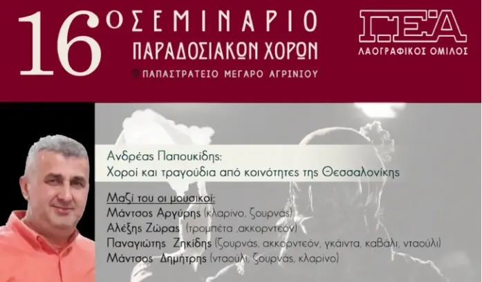 Ο Λαογραφικός Όμιλος της Γυμναστικής Εταιρείας Αγρινίου (ΓΕΑ), συνεχίζοντας μια μακροχρόνια παράδοση, διοργανώνει φέτος το 16ο σεμινάριο παραδοσιακών χορών το Σάββατο και Κυριακή 15-16 Νοεμβρίου 2025 στο Παπαστράτειο Μέγαρο Αγρινίου.