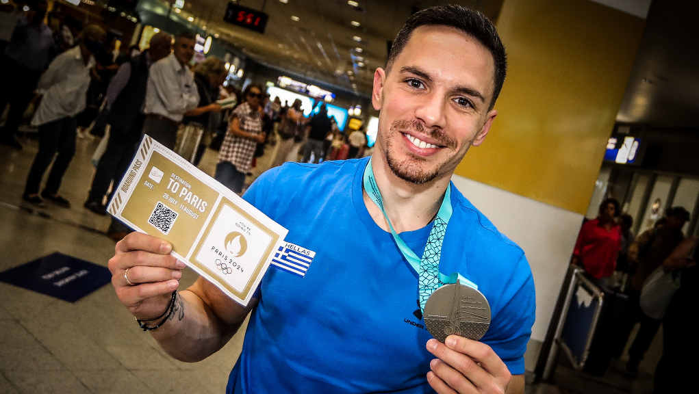 Ο Έλληνας πρωταθλητής την Κυριακή το μεσημέρι επέστρεψε στην Ελλάδα μαζί με την οικογένεια του και έδειχνε από τη μία το ασημένιο μετάλλιο που είχε στο λαιμό του και από την άλλη το εισιτήριο για τους Ολυμπιακούς Αγώνες στο Παρίσι.