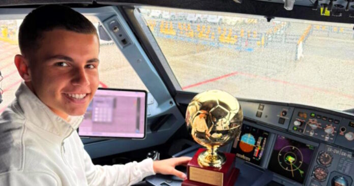 Ο 19χρονος χαφ πόζαρε, μάλιστα, σε ρόλο πιλότου, χωρίς να αποχωριστεί το βραβείο ούτε στο αεροπλάνο της επιστροφής.