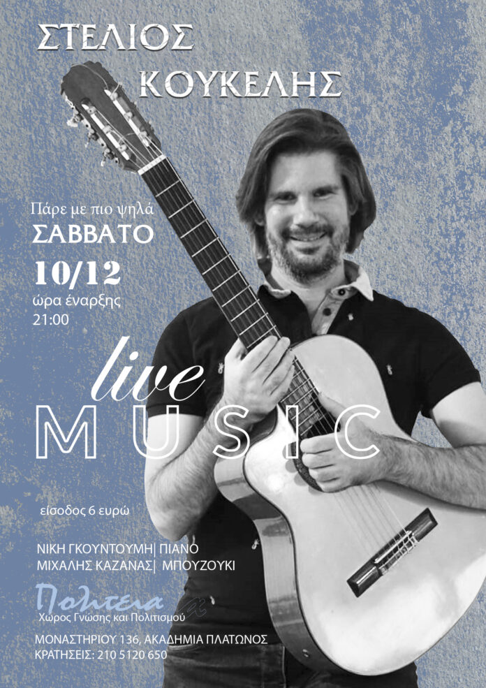 Ο ταλαντούχος τραγουδοποιός και ερμηνευτής Στέλιος Κουκέλης έρχεται το Σάββατο 10 Δεκεμβρίου στον χώρο γνώσης και πολιτισμού ΠΟΛΙΤΕΙΑ στην Ακαδημία Πλάτωνος, σηματοδοτώντας με την Ερωτική του μπαλάντα “Πάρε με πιο ψηλά”(Ντουέτο με τη Ναταλία Ρασούλη) ένα σύνολο με τα ωραιότερα ερωτικά τραγούδια του χθες και του σήμερα από την έντεχνη ελληνική σκηνή του ρεμπέτικου και του λαϊκού μας τραγουδιού.