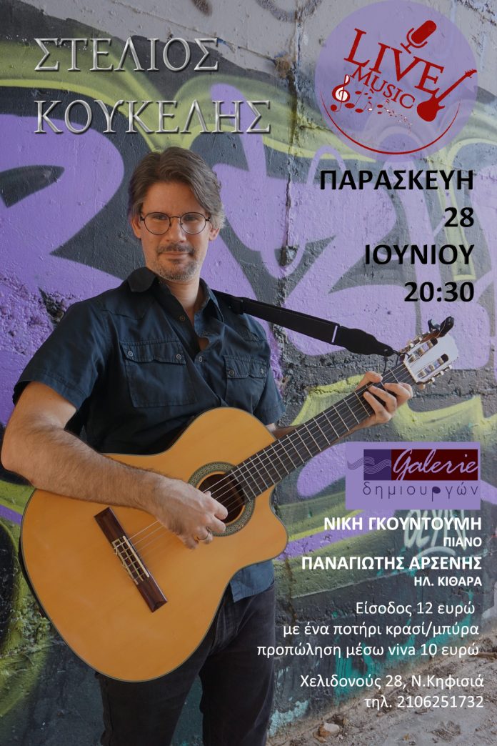 Ο τραγουδοποιός και ερμηνευτής Στέλιος Κουκέλης συνεχίζοντας τις καλοκαιρινές του εμφανίσεις έρχεται για ένα ακόμα δυναμικό live στον όμορφο πολυχώρο τέχνης Galerie Δημιουργών στην Κηφισιά, την Παρασκευή 28 Ιουνίου στις 20:30.