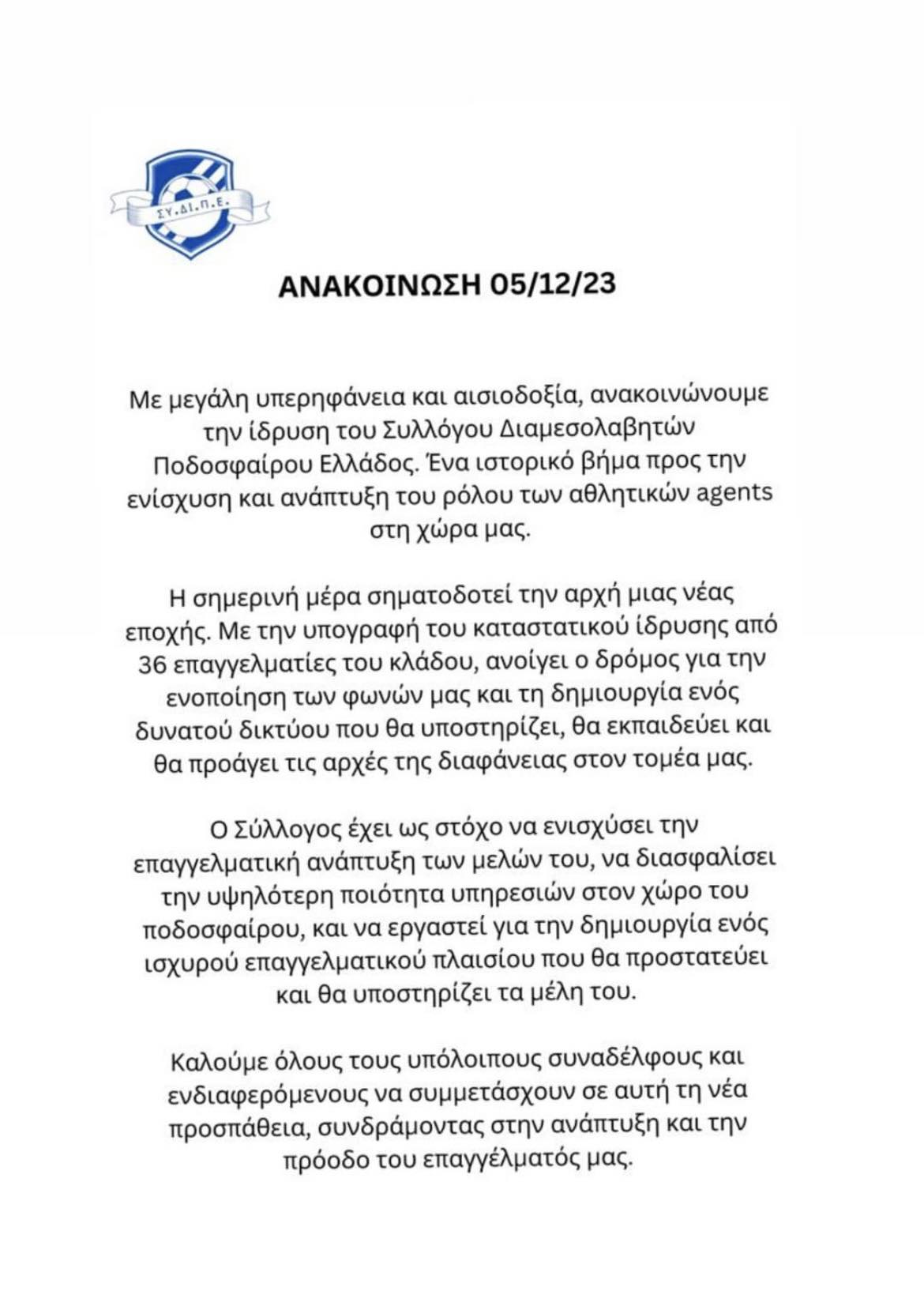 «Με μεγάλη υπερηφάνεια και αισιοδοξία ανακοινώνουμε την ίδρυση του Συλλόγου Διαμεσολαβητών Ποδοσφαίρου Ελλάδος, ένα ιστορικό βήμα για την ενίσχυση και ανάπτυξη του ρόλου των αθλητικών πρακτόρων στη χώρα μας.