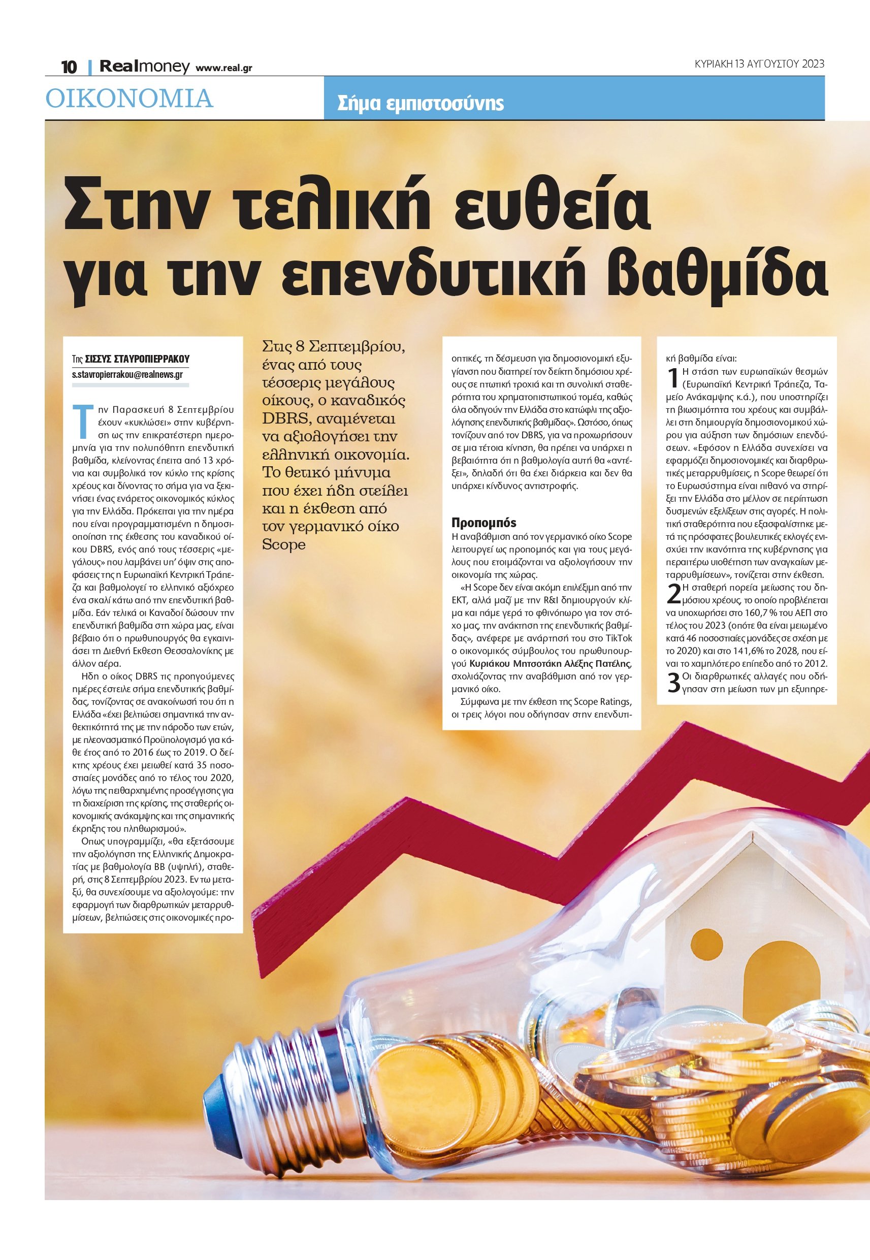 «Η Scope δεν είναι ακόμη επιλέξιμη από την ΕΚΤ, αλλά μαζί με την R&Ι δημιουργούν κλίμα και πάμε γερά το φθινόπωρο για τον στόχο μας, την ανάκτηση της επενδυτικής βαθμίδας», ανέφερε με ανάρτησή του στο TikTok ο οικονομικός σύμβουλος του Πρωθυπουργού Κυριάκου Μητσοτάκη Αλέξης Πατέλης, σχολιάζοντας την αναβάθμιση από τον γερμανικό οίκο.