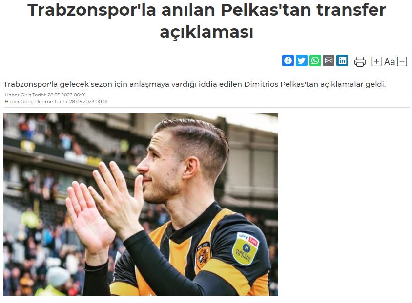 Πλήθος δημοσιευμάτων αναφέρουν ότι ο Πέλκας συμφώνησε με την Τραμπζονσπόρ και ότι απομένουν τα τυπικά για την τελική συμφωνία. Γεγονός που έρχεται σε αντίθεση με τα σενάρια των προηγούμενων ημερών που ενέπλεκαν τον “δικέφαλο του βορρά” με την απόκτηση του μεσοεπιθετικού.//
