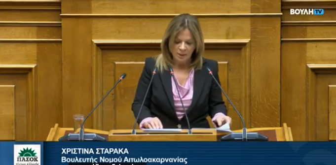 Σκληρή επίθεση στην κυβέρνηση εξαπέλυσε η βουλευτής Αιτωλοακαρνανίας του ΠΑΣΟΚ-Κινήματος Αλλαγής, Χριστίνα Σταρακά από το βήμα της Βουλής κατά τη συζήτηση της πρότασης δυσπιστίας.