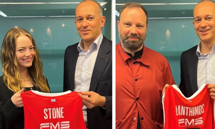 Οι αδελφοί Αγγελόπουλοι έδωσαν από μια φανέλα του Ολυμπιακού σε Έμα Στόουν και Γιώργο Λάνθιμο.