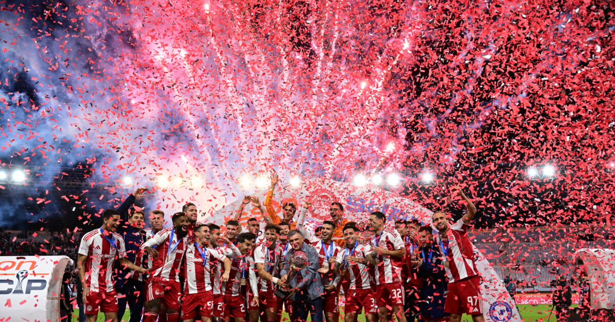 Οι παίκτες του Ολυμπιακού,ο κόσμος και ο Βαγγέλης Μαρινάκης πανηγύρισαν έντονα τον πρώτο τίτλο της σεζόν, που ακολούθησε μετά το περσινό νταμπλ στην Ελλάδα.