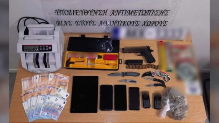 Μετά από έρευνες στην οικία του 32χρονου, βρέθηκαν 8.170 ευρώ, ένα πιστόλι και τέσσερα μαχαίρια, τα οποία κατασχέθηκαν.