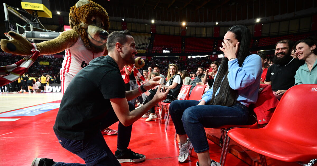 Στο τέλος της τρίτης περιόδου και σε συνεργασία με τη μασκότ του Ολυμπιακού, ο οπαδός των “ερυθρόλευκων” έκανε έκπληξη στην αγαπημένη του και γονάτισε μπροστά της, κάνοντας πρόταση γάμου στην κερκίδα.