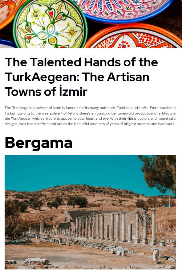 «Η επαρχία Σμύρνης του Τουρκοαιγαίου φημίζεται για τα πολλά αυθεντικά τουρκικά χειροτεχνήματα. Από το παραδοσιακό τούρκικο καπιτονέ μέχρι τα περίτεχνα ρούχα, υπάρχει μια συνεχής παραγωγή αιώνων από τεχνουργήματα στο Τουρκοαιγαίο που σίγουρα θα προσελκύσουν την καρδιά και τη ματιά σας» αναφέρεται χαρακτηριστικά σε ένα κείμενο, υπό τον τίτλο «Τα ταλαντούχα χέρια του Τουρκοαιγαίου: Οι τεχνίτες στις πόλεις της Σμύρνης».