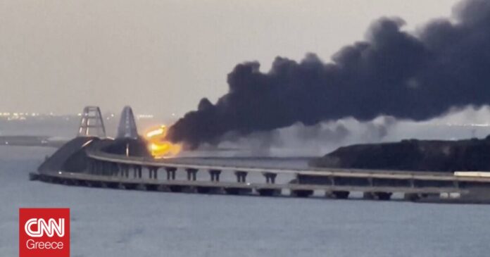 Η γέφυρα, η οποία κατασκευάστηκε —με μεγάλο κόστος— κατ’ εντολή του Βλαντίμιρ Πούτιν, επιτρέπει τη μεταφορά ρωσικού στρατιωτικού υλικού στις δυνάμεις που επιχειρούν στην Ουκρανία.