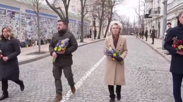 Ο Βολοντίμιρ Ζελένσκι συνοδευόμενος από την Πρόεδρο της Κομισίον και ηγέτες της Δύσης απέτισε φόρο τιμής στους χιλιάδες Ουκρανούς στρατιώτες που έχουν δώσει την ζωή τους στα πεδία των μαχών στο τείχος των πεσόντων στο κέντρο του Κιέβου, 730 ημέρες μετά τη ρωσική εισβολή.