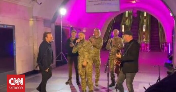 Ο Ιρλανδός ροκ σταρ Μπόνο και ο κιθαρίστας του συγκροτήματος U2 The Edge τραγούδησαν για την ελευθερία σε μια 40λεπτη συναυλία που έδωσαν σήμερα, Κυριακή σε έναν σταθμό του μετρό στο Κίεβο, προσευχήθηκαν για την ειρήνη και έπλεξαν το εγκώμιο των Ουκρανών για τη μάχη που δίνουν απέναντι στη Ρωσία.