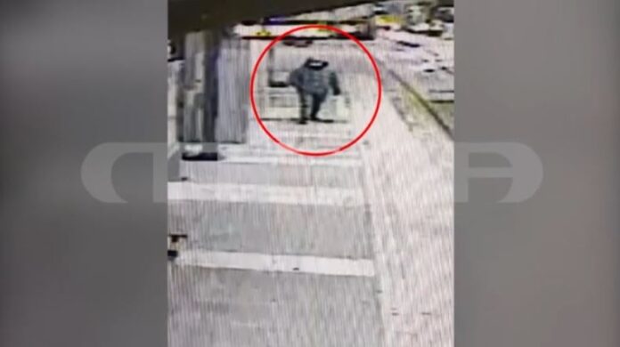 Φοράει κουκούλα και γάντια, ενώ στα χέρια κρατάει μια τσάντα. Οι κινήσεις του φαίνονται νευρικές.