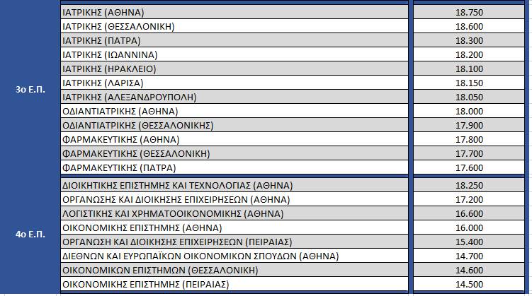 «Οι Ελάχιστες Βάσεις Εισαγωγής με τον κατώτερο συντελεστή 0,8 είναι 9,08 για τους υποψηφίους των Ανθρωπιστικών Σπουδών, 9,50 για τους υποψηφίους των Θετικών Σπουδών, 9,62 για τους υποψηφίους των Σπουδών Υγείας και 8,36 για τους υποψηφίους των Σπουδών Οικονομίας και Πληροφορικής», αναφέρει.