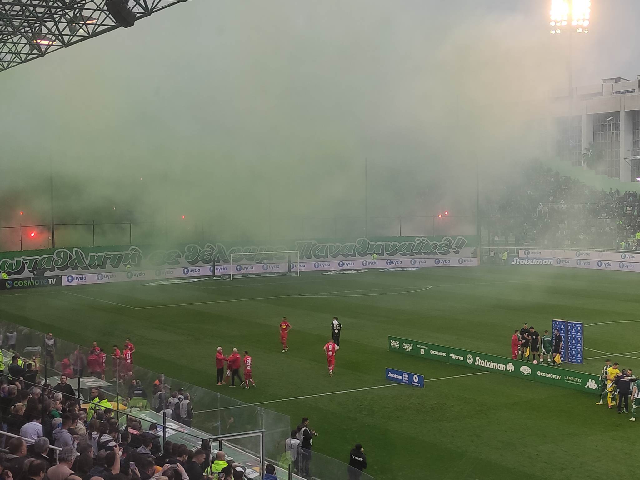Με μία ολιγόλεπτη καθυστέρηση άρχισε η αναμέτρηση ανάμεσα σε Παναθηναϊκό και Βόλο ΝΠΣ. Κατά την είσοδο των δύο ομάδων στον αγωνιστικό χώρο, οι φίλαθλοι του “τριφυλλιού” δημιούργησαν καυτή και αποπνικτική ατμόσφαιρα, ενώ είχαν και πανό στις Θύρες 13 και 14. Χαρακτηριστικά, το πανό γράφει: «Πρωταθλητή σε θέλουμε Παναθηναϊκέ».//