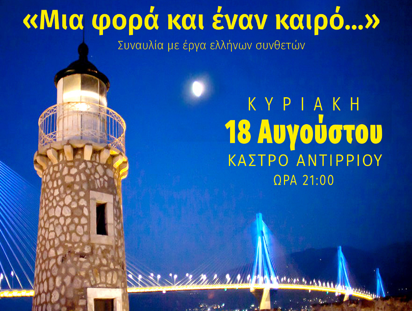 Ο Δήμος Ναυπακτίας σε συνεργασία με την Εφορεία Αρχαιοτήτων Αιτωλοακαρνανίας και Λευκάδος και τον Πολιτιστικό Σύλλογο Αντιρρίου «Το Καστέλι», προσκαλούν όλες και όλους σε μία ξεχωριστή συναυλία με τη Λυρική Σοπράνο Ελεάνα Βάσιου, την Κυριακή, 18 Αυγούστου 2024 και ώρα 21:00’ στο Κάστρο Αντιρρίου. Συμμετέχουν: στο πιάνο η Γεωργία Αναστάση και στα πνευστά ο Ελευθέριος Καραγιάννης.