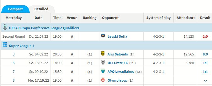 Οι ασπρόμαυροι ξεκίνησαν τη Super League με τρεις νίκες στα πρώτα τέσσερα παιχνίδια, αλλά στα τελευταία τρία έχουν δύο ισοπαλίες και μια ήττα, γεγονός που τους έχει φέρει στο -9 από την κορυφή και τον Παναθηναϊκό. Δύο ισοπαλίες με τον ΟΦΗ στην Κρήτη (1-1) και τον Λεβαδειακό στη Βοιωτία (1-1), με τον Δικέφαλο να δέχεται τα γκολ στα τελευταία λεπτά, αλλά και μια ήττα από τον Παναθηναϊκό στην Τούμπα με 2-1, για την 6η αγωνιστική.