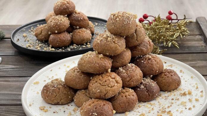 Αλέθουμε στον πολυκόφτη όλα τα υλικά και πασπαλίζουμε με το μείγμα τα μελομακάρονα στην επιφάνεια.