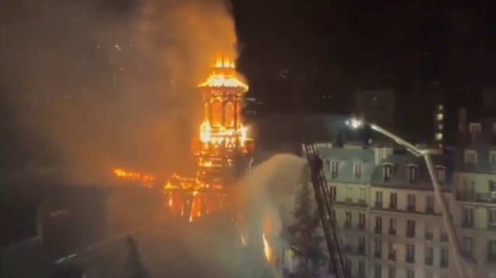 Σε βίντεο που κυκλοφόρησαν στα μέσα κοινωνικής δικτύωσης, αποτυπώνεται το καμπαναριό του κτιρίου το οποίο έχει τυλιχτεί στις φλόγες.
