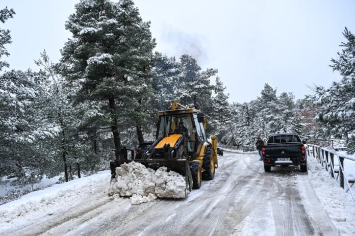 Ωστόσο, ο όγκος του χιονιού είναι τέτοιος, που το ερπυστριοφόρο κόλλησε και για να απεγκλωβιστεί επιστρατεύθηκε ένα Caterpillar του Στρατού.