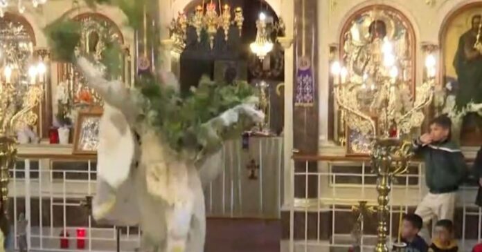 Ο ιερέας λίγο μετά τις 08:30, εμφανίστηκε μπροστά στους πιστούς και πέταξε βάγια με το καθιερωμένο σάλτο του για την πρώτη Ανάσταση.