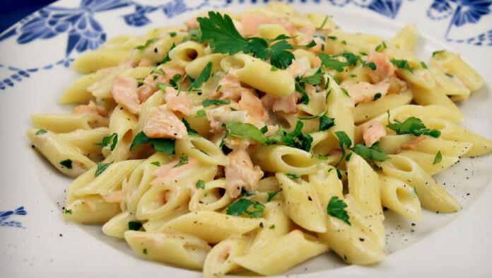 Πεντανόστιμες πένες με σολομό και κουκουνάρι