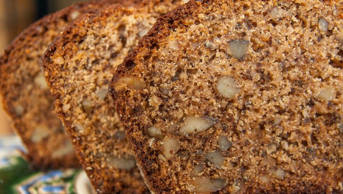 Σε ένα μεγάλο μπολ αναμειγνούμε όλα τα υγρά υλικά με τη ζάχαρη, το γαρύφαλο, την κανέλα και τη μαγειρική σόδα. Κοσκινίζουμε το αλεύρι, το προσθέτουμε στο μείγμα και ανακατεύουμε καλά με σύρμα. Ρίχνουμε τα καρύδια και τις σταφίδες και ανακατεύουμε καλά μέχρι να ενσωματωθούν καλά τα υλικά.