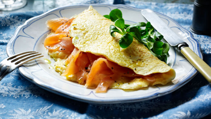 Στο πιάτο, εναλλάσσετε τα κομμάτια της ομελέτας με τις φέτες του σολομού ανάμεσα, σχηματίζοντας ένα πυργάκι. Σε κάθε στρώση, προσθέτετε μερικές σταγόνες λεμόνι, πιπέρι και άνηθο.