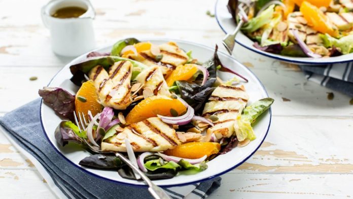 Τρίψτε το καρότο μέσα στο μπολ με το ντρέσινγκ και ανακατέψτε απαλά. Ζεσταίνετε λίγο λάδι σε ένα τηγάνι και ψήνετε το χαλούμι για λίγα λεπτά μέχρι να πάρει χρώμα και από τις δύο πλευρές. Περάστε το baby σπανάκι μέσα από τα καρότα που έχετε στρώνει. Τοποθετήστε το μείγμα σε πιάτα και προσθέστε από πάνω το χαλούμι και τα πορτοκάλια.