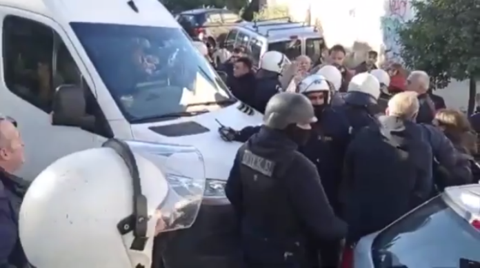 Άνδρες των ΜΑΤ και της ΟΠΚΕ είχαν από νωρίς παραταχθεί στους δρόμους περιμετρικά του σπιτιού όπου επρόκειτο να γίνει η έξωση. Δεκάδες γείτονες και αλληλέγγυοι, όπως και τις προηγούμενες τρεις φορές, παρενέβησαν.