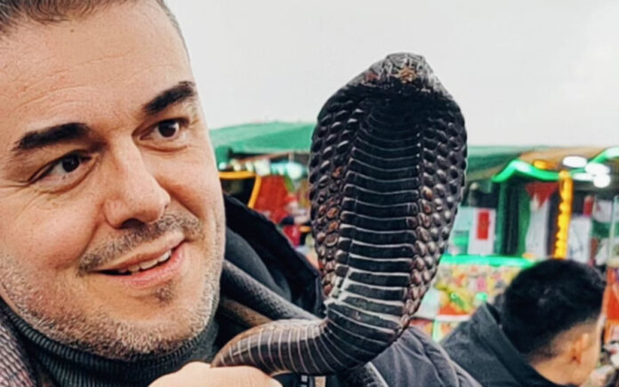 Ίσως γι’ αυτό και είχε το θάρρος όχι μόνο να πλησιάσει την κόμπρα -βρίθει ο τόπος από φίδια στις αγορές- που χρησιμοποιούνται για να μαγεύουν τους τουρίστες, αλλά και να την πιάσει να τη…φορέσει γύρω από το κεφάλι του σε απόσταση αναπνοής από το πρόσωπό του….