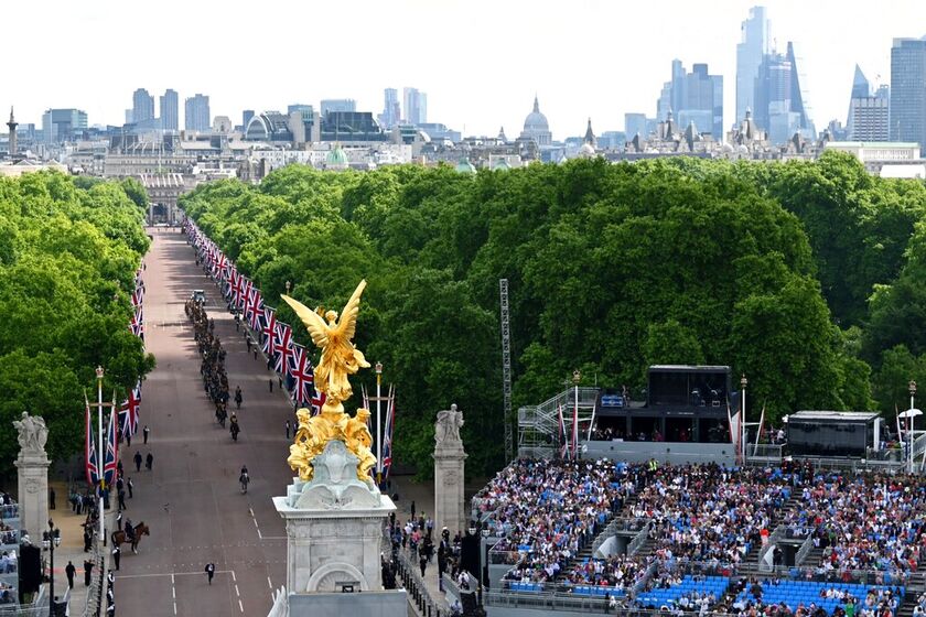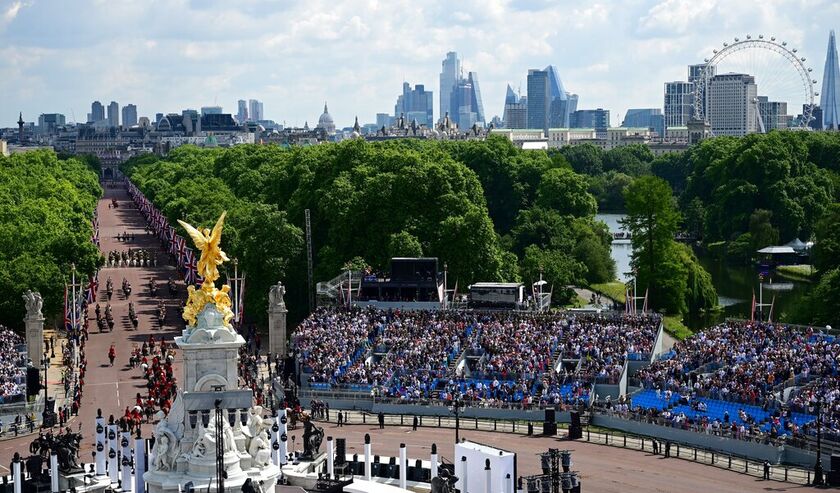 Η βασίλισσα ντυμένη στα γαλάζια, κρατώντας ένα μπαστούνι στο χέρι και συνοδευόμενη από τον ξάδερφό της, τον δούκα του Κεντ, έφτασε στα Ανάκτορα του Μπάκιγχαμ από όπου παρακολούθησε με τα υπόλοιπα μέλη της βασιλικής οικογένειας τους εορτασμούς με τους στρατιώτες του Βασιλικού Οίκου να παρελαύνουν, ενώ δεκάδες χιλιάδες άνθρωποι είχαν πλημμυρίσει τους δρόμους του Λονδίνου.