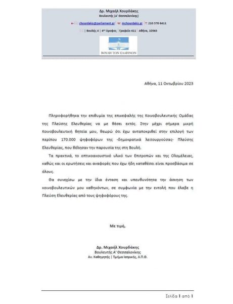 «Με την παρούσα δήλωση σας ενημερώνουμε ότι ο κ. Μιχάλης Χουρδάκης τίθεται εκτός της Κοινοβουλευτικής Ομάδας της Πλεύσης Ελευθέριας έως ότου παραδώσει την έδρα της Πλεύσης Ελευθερίας που κατέχει, εντός της τρέχουσας εβδομάδας, όπως του έχει ζητηθεί και συμφωνηθεί. Οι λόγοι αφορούν την εύρυθμη, ομαλή και απρόσκοπτη λειτουργία της Κοινοβουλευτικής Ομάδας της Πλεύσης Ελευθερίας στο πολύ βαρύ έργο που αυτή έχει επωμιστεί και συνεχίζει να επιτελεί στο Ελληνικό Κοινοβούλιο. Του ευχόμαστε καλή επιτυχία στη συνέχεια της σταδιοδρομίας του».