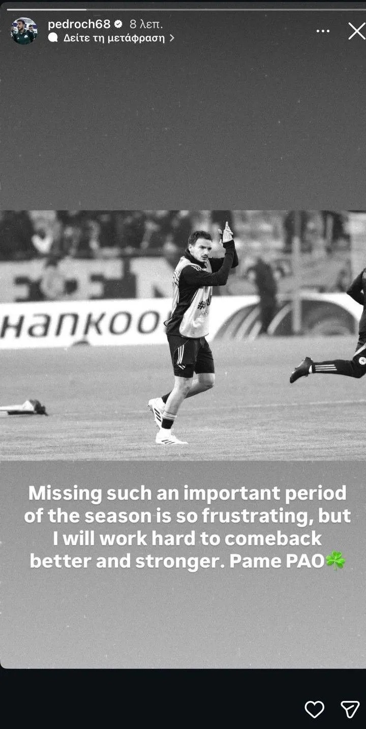 Σε ανάρτησή του στο Instagram, ο Πέδρο Τσιριβέγια έγραψε: «Το να χάνεις μια τόσο σημαντική περίοδο της σεζόν είναι τόσο εκνευριστικό, αλλά θα δουλέψω σκληρά για να επιστρέψω καλύτερος και πιο δυνατός. Πάμε ΠΑΟ».