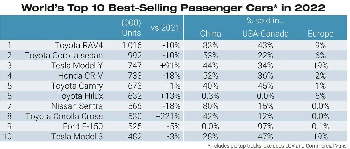 Όπως μπορείτε να δείτε στον πίνακα που ακολουθεί πρώτο, με ένα και πλέον εκατομμύρια πωλήσεις είναι το Toyota RAV4. Άξιο λόγου είναι πως το 43% αυτών των πωλήσεών του αντιστοιχεί στις ΗΠΑ και στον Καναδά, ενώ στη δεύτερη θέση βρίσκεται ένα άλλο Toyota, η Corolla σεντάν.