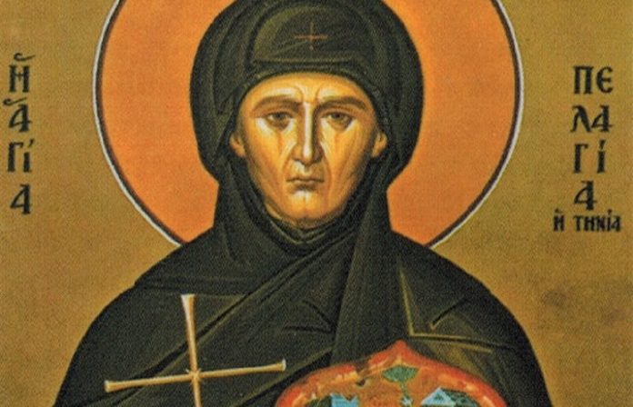 Η Πελαγία ήταν κόρη του παπά Νικηφόρου Νεγρεπόντη. Η μητέρα της ήταν από τον Τριπόταμο της Τήνου και άνηκε στην οικογένεια Φραγκούλη. Γεννήθηκε το 1752 μ.Χ. στο χωριό Κάμπο της Τήνου και το κοσμικό της όνομα ήταν Λούκια. Από διάφορα έγγραφα φαίνεται ότι είχε ακόμα τρεις αδελφές. Η οικογένειά της διακρινόταν για την αγνή πίστη και την προσήλωση στα θρησκευτικά ιδεώδη.
