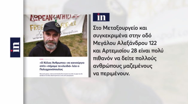 «Στο Μεταξουργείο και συγκεκριμένα στην οδό Μεγάλου Αλεξάνδρου 122 και Αρτεμισίου 28 είναι πολύ πιθανόν να δείτε πολλούς ανθρώπους μαζεμένους να περιμένουν. Εκεί βρίσκεται το “Σπίτι του Άλλου Ανθρώπου», ένας χώρος όπου μπορεί όποιος έχει ανάγκη να φάει, να κάνει ένα μπάνιο, να πλύνει τα ρούχα του και να ακούσει έναν καλό λόγο. Πριν μερικά χρόνια, ο ‘Αλλος Άνθρωπος’ στεγαζόταν στην οδό Πλαταιών 55 -ένας μεγαλύτερος χώρος από τον σημερινό που όμως για διάφορους λόγους έπρεπε να αδειάσει. Θυμάμαι μια Τσικνοπέμπτη, καλή ώρα, πριν 4 ή 5 χρόνια, που είχα βρεθεί ανάμεσα στις ψησταριές του Πολυχρονόπουλου και της Έλενας, όλοι φέραμε κάτι σε στιλ ρεφενέ (τσίπουρο, πατάτες, ψωμάκι και ό, τι άλλο) και τρώγαμε σαν μια παρέα δεκάδες άνθρωποι», γράφει το «in.gr.»