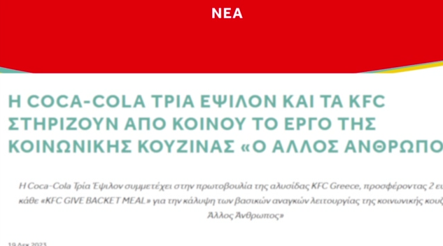 «Η Coca-Cola Τρία Έψιλον συμμετέχει για πρώτη φορά στην πρωτοβουλία των KFC «KFC GIVE BACKET MEAL», η οποία οργανώνεται για τρίτη συνεχόμενη χρονιά, δίνοντας την ευκαιρία στους καταναλωτές να μοιράσουν τη γεύση των Χριστουγέννων και να κάνουν καλύτερη τη ζωή συνανθρώπων μας που έχουν ανάγκη . Με την αγορά κάθε γεύματος και κοστίζει 19,90€ από 28,90€, προσφέρεται το ποσό των 2€ για να καλυφθούν βασικές ανάγκες λειτουργίας της κοινωνικής κουζίνας «ο Άλλος Άνθρωπος», έτσι ώστε να συνεχίσει το έργο της και να μοιράσει περισσότερα γεύματα αγάπης. Ο αριθμός των KFC Give Backet Meals εκτιμάται ότι θα ανέλθει στα 30.000».