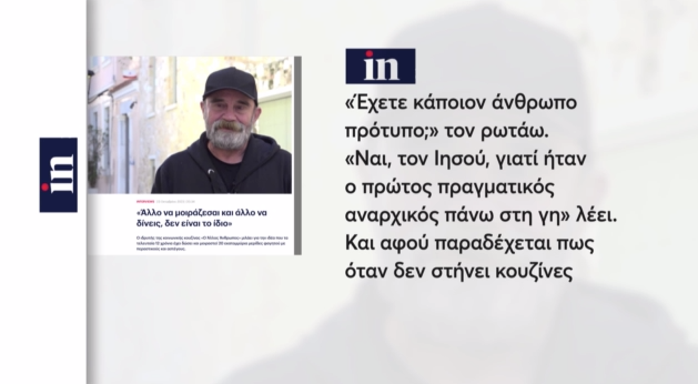 «Έχετε κάποιον άνθρωπο πρότυπο;» τον ρωτάω. «Ναι, τον Ιησού, γιατί ήταν ο πρώτος πραγματικός αναρχικός πάνω στη γη» λέει. Και αφού παραδέχεται πως όταν δεν στήνει κουζίνες συνήθως, λόγω εξάντλησης, κοιμάται, του απευθύνω την προτελευταία ερώτηση της συνάντησής μας που αφορά μελλοντικούς του στόχους. «Ο ένας είναι η αγορά αυτού του χώρου απέναντι, ώστε όταν φύγω εγώ να συνεχιστεί «Ο Άλλος Άνθρωπος». Και ο άλλος είναι ένα αυτοκινούμενο τροχόσπιτο για να γυρίσω όλο τον κόσμο μαγειρεύοντας και να μεταδώσω την ιδέα του «Άλλου Ανθρώπου» αποκαλύπτει. «Και από ποια πόλη θα ξεκινούσατε;» τον ρωτάω. Κι εκείνος, με ένα χαμόγελο πλατύ, απαντά: «Από την Αθήνα, αγάπη μου. Από το Α. Μη σου πω από το Αιγάλεω γιατί είναι η μοναδική πόλη στον κόσμο που ξεκινάει από Α και τελειώνει σε Ω. Η αρχή και το τέλος», γράφει στο «in.gr».