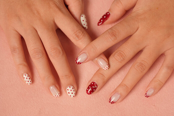 Για εσάς που αγαπάτε το κόκκινο, μπορείτε να κάνετε ένα κόκκινο γαλλικό και να σχηματίσετε λευκές βούλες πάνω της, για να πετύχετε ένα κοριτσίστικο και ρετρό nail look.